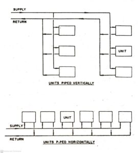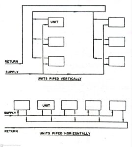 در این سیستم برای برگشت آب از مبدل‌های حرارتی به دیگ وله مستقلی در نظر گرفته نمی‌شود بلکه همانطور که در شکل ۱ مشاهده می‌گردد ت رفت و برگشت آب به مبدل‌های حرارتی تنها از یک لوله اصلی استفاده می‌شود برای اتصال لوله‌های رفت و برگشت مبدل حرارتی به لوله اصلی در این سیستم وساله‌های مخصوص استفاده می‌شود که در شکل ۲ نشان داده شده‌اند در این سیستم قطر لوله اصلی در تمام طول مسیر ثابت بوده دمای آب ورودی به واحدهای نزدیک‌تر به دیگ بیشتر و واحدهای دورتر به تدریج کمتر می‌شود ذا مبدله‌های حرارتی دورتر را باید بزرگتر در نظر گرفت.
