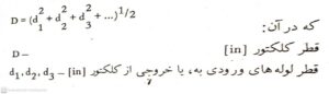 6_ تعیین قطر کلکتورهای موتورخانه – کلکتور لوله قطوری است در حکم یک مخزن کوچک و هنگامی که قرار است آب از چند مسیر مختلف به دستگاههایی مثل پمپ یا دیگ وارد یا خارج شود، مورد استفاده قرار میگیرد نقش کلکتور عبارتست از ایجاد جریان صحیح آب در هر یک از مسیرها طول کلکتور به این ترتیب تعیین میگردد که فاصله بین لوله هایی که به کلکتور وارد یا از آن خارج می شوند حداقل ۱۲ و از طرفین نیز حدود ۸ در نظر گرفته می شود (شکل۶) قطر کلکتور نیز از فرمول تجربی زیر تعیین می گردد: