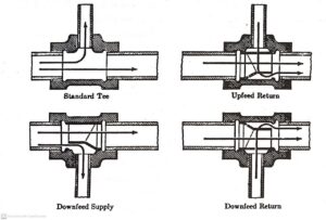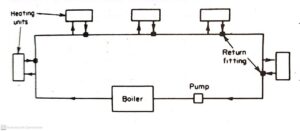 در این سیستم برای برگشت آب از مبدل‌های حرارتی به دیگ وله مستقلی در نظر گرفته نمی‌شود بلکه همانطور که در شکل ۱ مشاهده می‌گردد ت رفت و برگشت آب به مبدل‌های حرارتی تنها از یک لوله اصلی استفاده می‌شود برای اتصال لوله‌های رفت و برگشت مبدل حرارتی به لوله اصلی در این سیستم وساله‌های مخصوص استفاده می‌شود که در شکل ۲ نشان داده شده‌اند در این سیستم قطر لوله اصلی در تمام طول مسیر ثابت بوده دمای آب ورودی به واحدهای نزدیک‌تر به دیگ بیشتر و واحدهای دورتر به تدریج کمتر می‌شود ذا مبدله‌های حرارتی دورتر را باید بزرگتر در نظر گرفت.