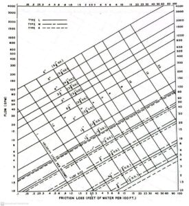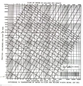 لازم به ذکر است که بهترین اختلاف دمای آب رفت و لازم به توضیح برگشت در سیستم اجباری (پمپی) برابر F 20 برای گرمایش و F 10 برای سرمایش میباشد که در سیستمهای طبیعی این اختلاف دما بیشتر است. بنابراین در سرمایش با سیستم اجباری مخرج فرمول فوق ۵۰۰۰ خواهد بود. محور بالایی نمودارهای ۱ و ۲ براساس مقادیر دبی آب و محور پایینی آنها بر پایه مقدار حرارتی که توسط آب در گرمایش حمل میگردد مدرج گردیده است، لذا برای استفاده از این نمودارها در گرمایش) احتیاجی به تعیین آب از فرمول فوق نیست و میتوان با در دست داشتن مقدار دبی حرارتی که توسط آب داخل لوله حمل میشود مستقیماً به نمودارهای مذکور مراجعه نمود. نکته قابل تذکر اینست که محور پایینی با توجه به 20F اختلاف دمای آب رفت و برگشتAt گردیده است و برای At غیر از F 20 باید مقدار حرارتی را که توسط آب حمل می شود در ضریب At×۲۰ ضرب نمود آنگاه به نمودار مراجعه کرد.