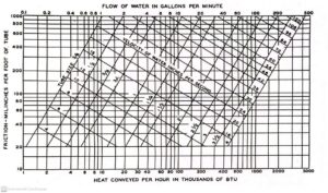 5_ تعیین قطر لوله‌ها با معلوم بودن مقدار حرارتی که توسط آب در لوله مورد نظر حمل می‌ شود به نمودار ۱ (بالاتر) مراجعه نموده از تقاطع خطوط بار حرارتیو افت فشار مناسب (۳۰۰ میلی اینچ آب بر فوت) نقطه ای بدست می آورید که با توجه بت موقعیت آن می توانیم قطر لوله مورد نظر و سرعت جریان را بدست می آید.